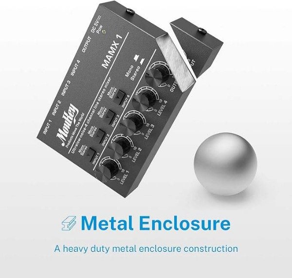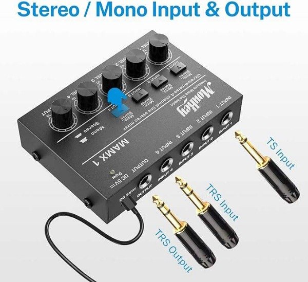 El Donner MAMX1 (también conocido como Moukey-4) es un mixer de audio compacto de 4 canales, diseñado para combinar señales a nivel de línea (no para micrófonos sin preamplificador), ideal para mezclar sonidos de teclados, reproductores de streaming, etc., que se alimenta por USB y tiene un buen precio, ofreciendo controles de volumen por canal y modo mono/estéreo, perfecto como submezclador o para uso básico casero.
